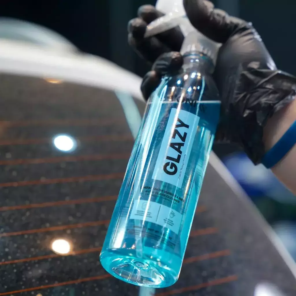 GLAZY é um produto 4 em 1, de alta tecnologia, desenvolvido para vidros em geral, que limpa, protege, condiciona e atua como redutor de riscos. O produto contém polímeros especiais que reduzem o atrito no vidro, diminuindo as chances de riscos causados por limpadores de para-brisas e movimentações dos vidros laterais. Deixa um toque liso e aspecto de vidro novo